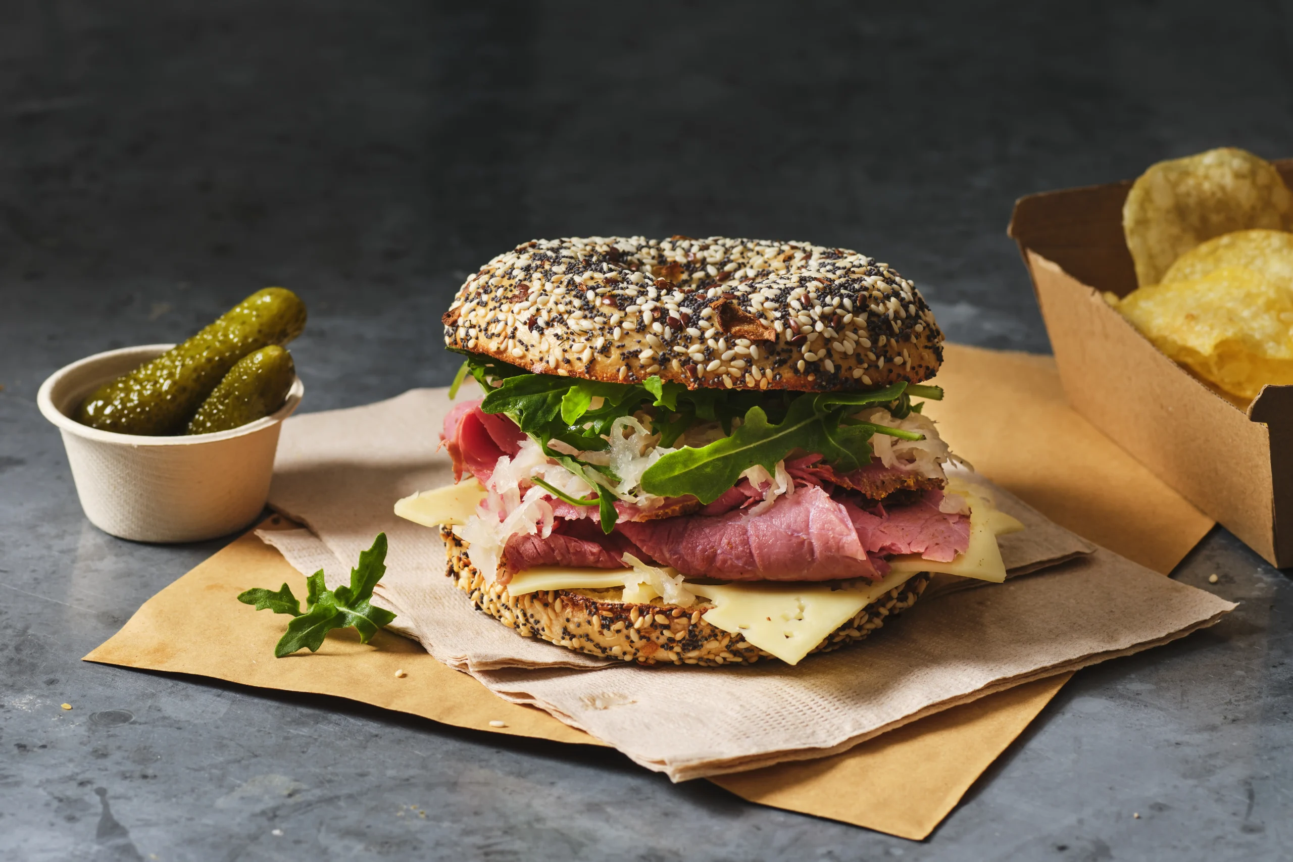 - Top toasted bagel with Tangy Dressing, Swiss cheese, shaved corned beef or pastrami, sauerkraut and rocket.
