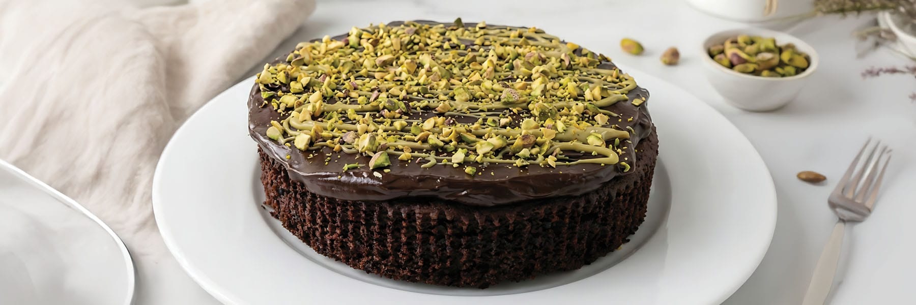 - Top cake with ganache, drizzle with pistachio paste and finish with chopped pistachios