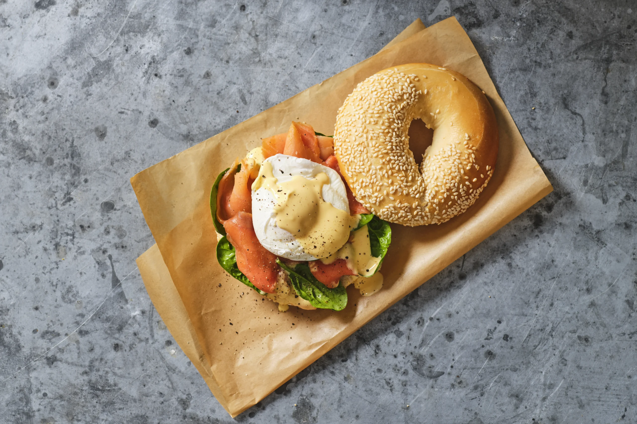 - Top toasted bagel with baby spinach leaves, smoked salmon and poached eggs.